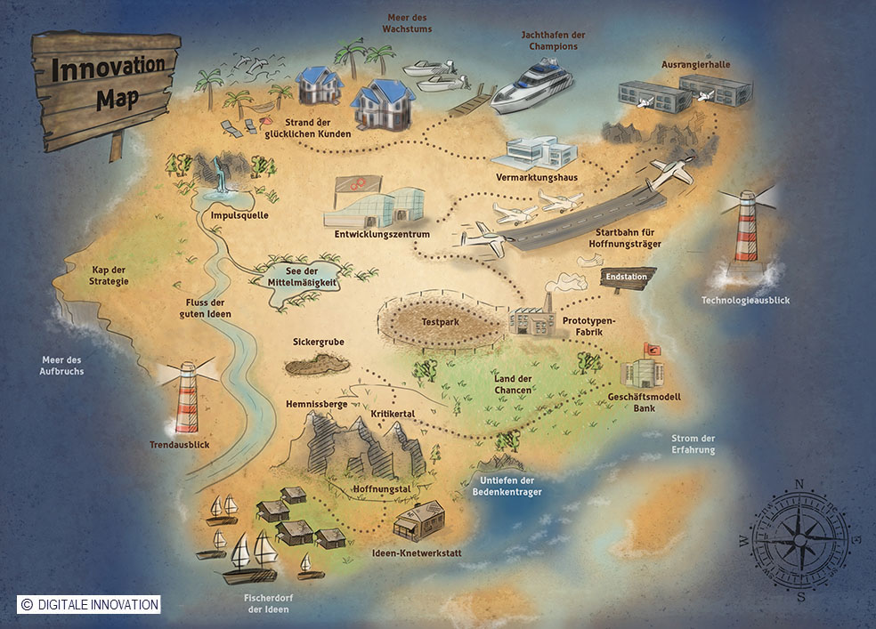 Erneuerungen erwachsen aus strategischen Impulsen – hier dargestellt im Westen der Landkarte als „Impulsquelle“, die sich aus dem „Meer des Aufbruchs“ und „Kap der Strategie“ speist. Nur ein kleiner Teil der neuen Ideen werden im Unternehmen weitergeführt – die meisten bereits in früher Phase aussortiert („See der Mittelmäßigkeit“). Diejenigen Geschäftsideen, die Krititken standhalten und auf kritische Fragen robuste Antworten liefern, bahnen sich ihren Weg im „Fluss der guten Ideen“. Basieren diese auf Technologie- und Markttrends („Trendausblick“), steigt deren Chance auf weitere Beachtung von Stakeholdern im Unternehmen.